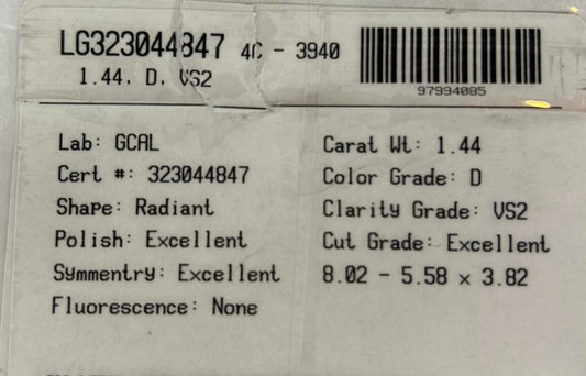 1.44ct Lab Grown Radiant Cut Diamond Eng Ring