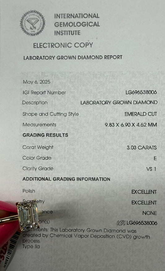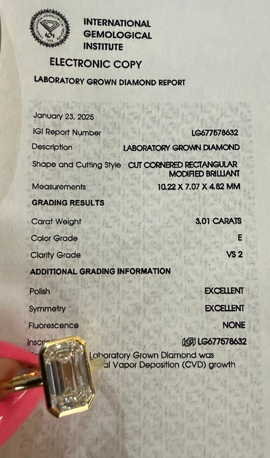 14KY 3.01ct Emerald Cut Lab Grown Diamond Engagement