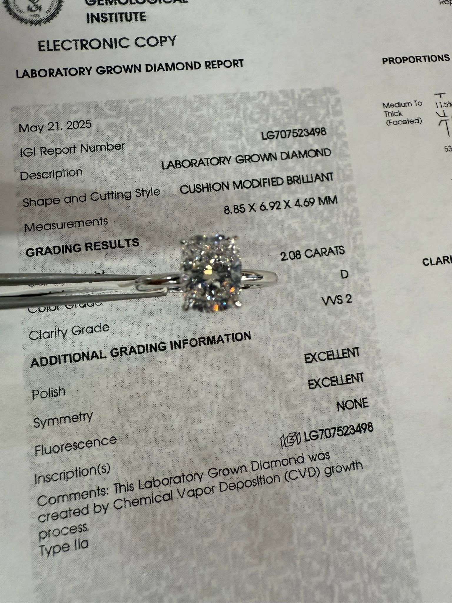 14KW 2.08ct Cushion Cut Lab Grown Diamond Engagement Ring IGI report included Free Sizing Full replacement value appraisal included